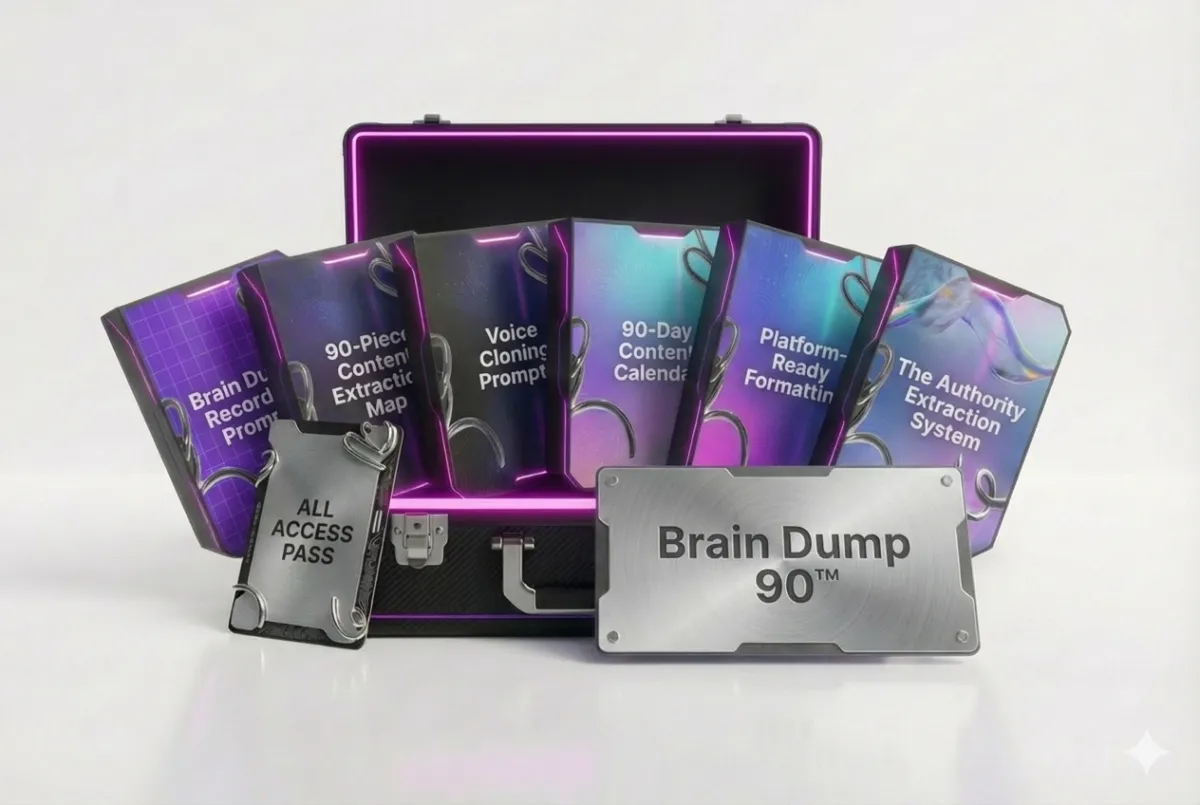 Instant access to the complete Brain Dump 90™ system: the Authority Extraction framework, recording prompts, the 90-piece content map, platform-specific formatting, a 90-day content calendar, and our voice-cloning prompts. Everything you need to turn 5-10 minutes of talking into 90 days of content.